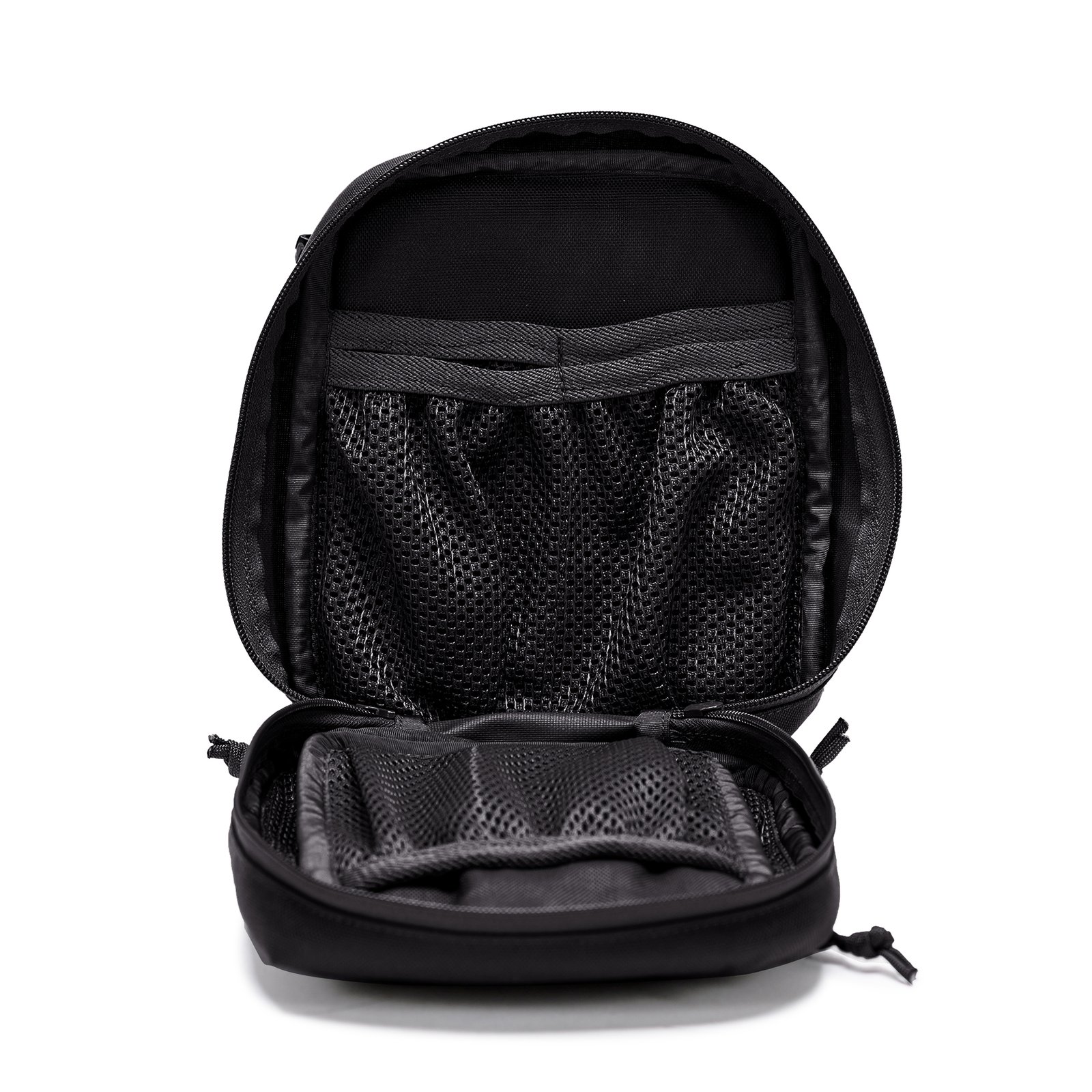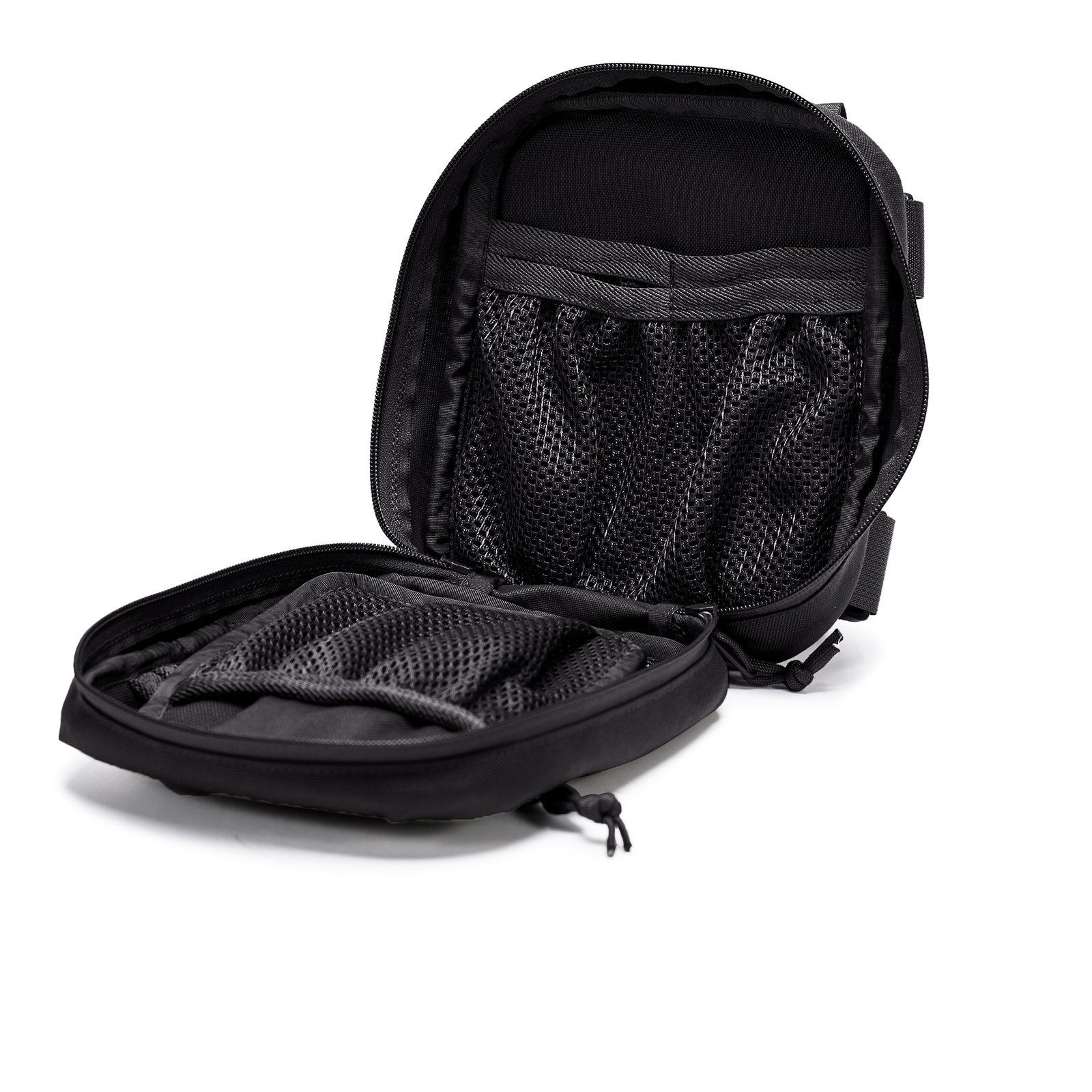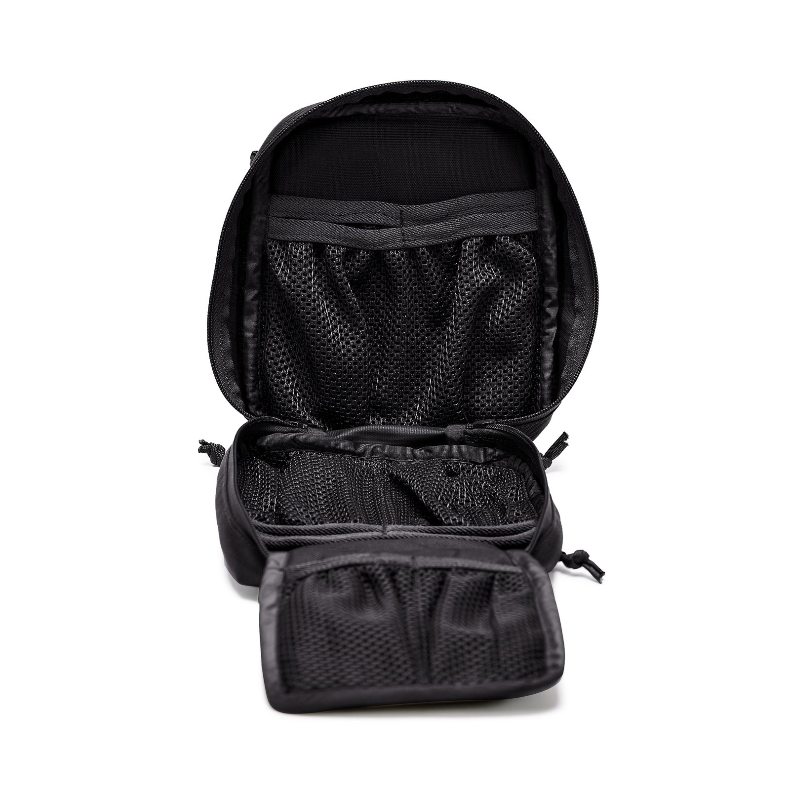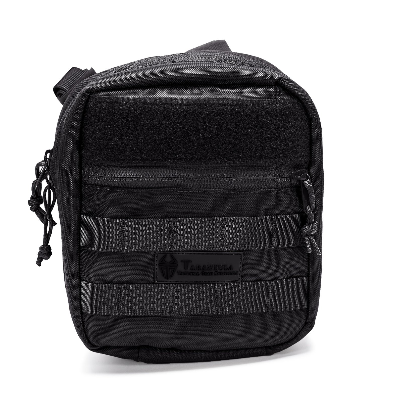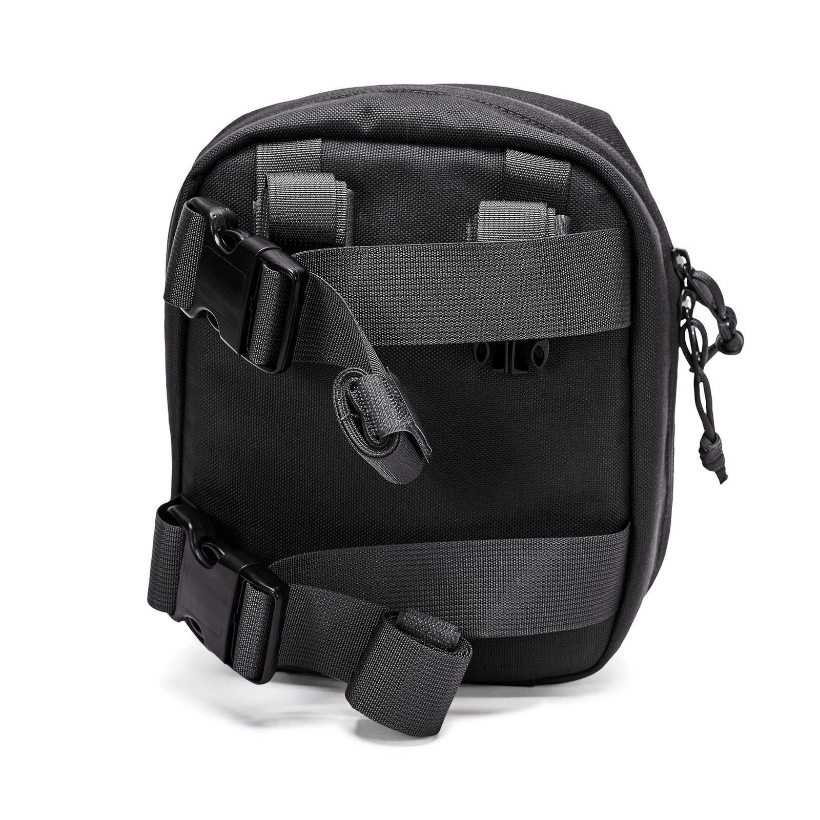 On the exterior of the thigh pouch, there is Velcro for labeling, a small zipper pocket, and a MOLLE system for connecting additional pouches.